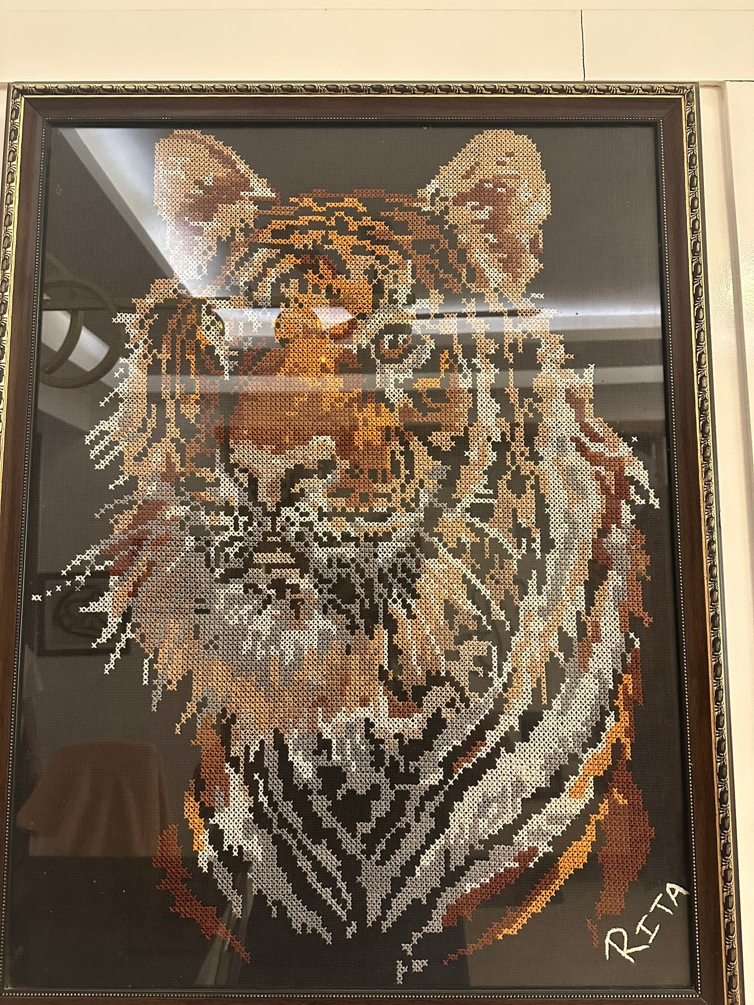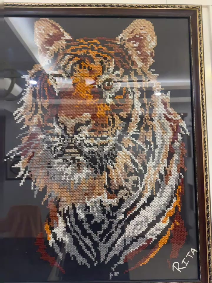 Unlike traditional paintings, this piece is meticulously hand-stitched, where each tiny cross represents hours of dedication. The texture created by the embroidery threads gives the artwork a unique dimensionality, allowing light to play across the surface and enhance the realism of the tiger’s gaze. The dark background serves as a perfect contrast, amplifying the tiger’s majestic presence and highlighting its natural beauty.